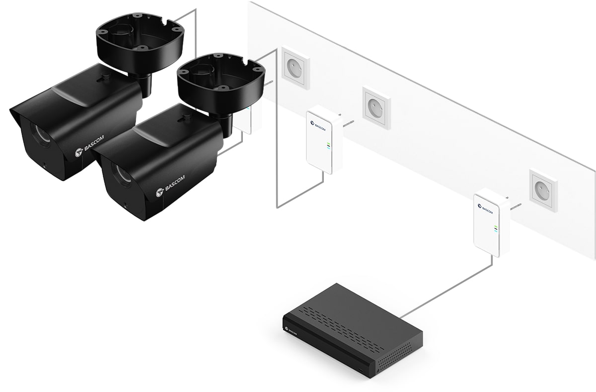 Ce système de vidéosurveillance est équipé de Bascom® POWER, notre technologie révolutionnaire qui transmet les images via le réseau électrique. Il vous suffit de brancher les caméras sur une prise de courant : elles se connectent automatiquement à l’enregistreur en utilisant vos câbles électriques existants. Vous bénéficiez ainsi de la fiabilité d’une connexion filaire, sans avoir à tirer de câbles vous-même.