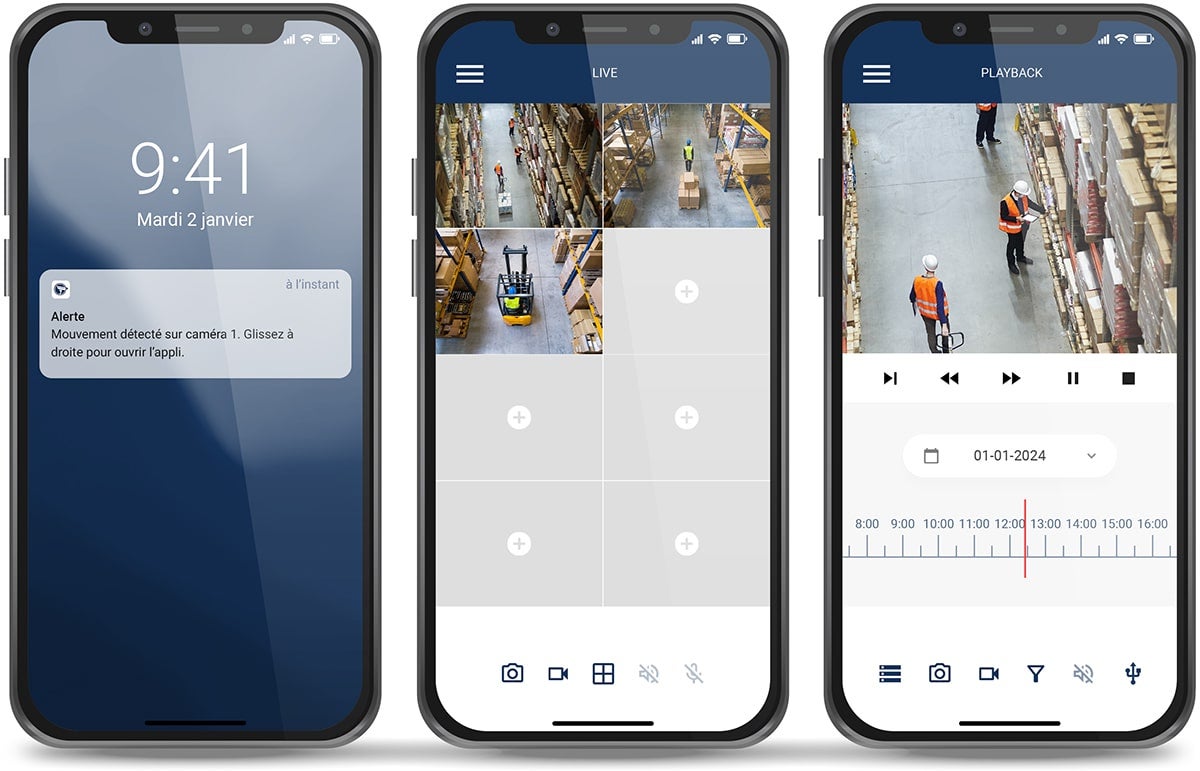 Avec l’application mobile Bascom, vous accédez à vos caméras partout dans le monde. Il vous suffit de scanner le QR code de l’enregistreur pour vous connecter. Vous pouvez ensuite visionner les flux en direct, consulter les enregistrements et créer des sauvegardes. L’application prend en charge plusieurs systèmes de caméras, pour une gestion centralisée.